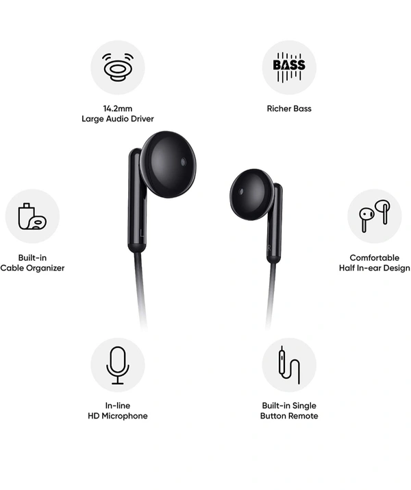 realme Buds क्लासिक वायर्ड ईयरफ़ोन 14.2 mm ड्राइवर, इन-लाइन HD माइक्रोफ़ोन, ऑर्गनाइज़र केबल और टेंगल फ़्री डिज़ाइन के साथ काला