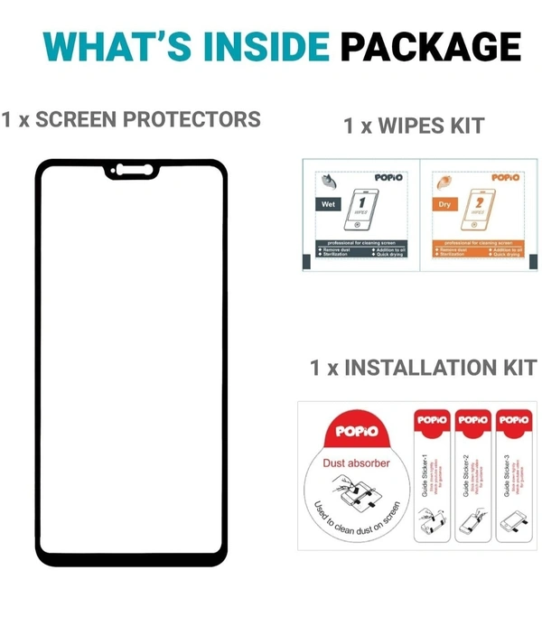 विशेषताएं और विवरण Compatible Device: OnePlus 6 | Area of coverage: Edge to Edge Full Screen Coverage Hardness: High hardness level provides protection from accidental drop & scratches Easy Installation: Contains 1 wet wipe, 1 dry wipe, alignment stickers Additional features: Bubble proof, Scratch resistant, Anti fingerprint, Anti-glare, Anti-shatter, Touch sensitive Popio Oneplus 6 tempered glass original 6d With Japanese Asahi Glue